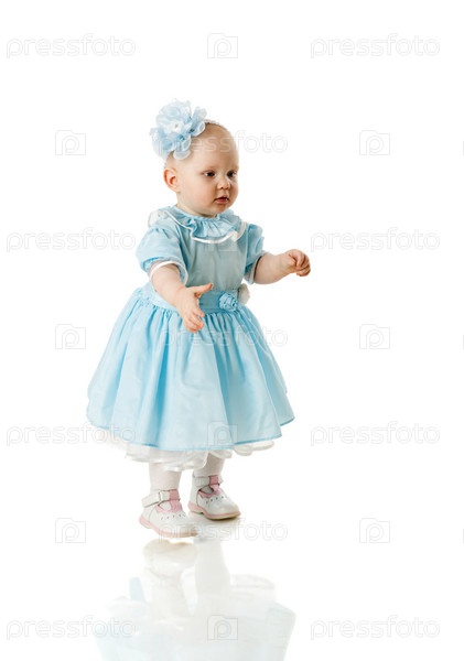 Маленькая девочка делает первые шаги. Белый фон