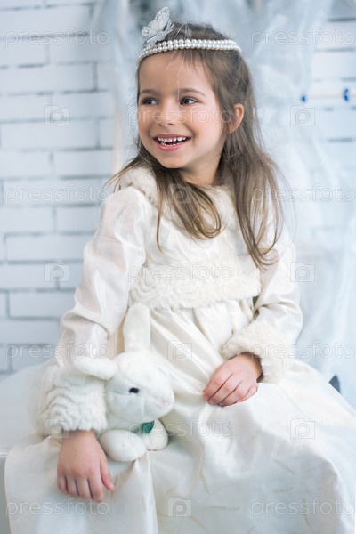 Девочка в зимнем праздничном платье с игрушечным кроликом
