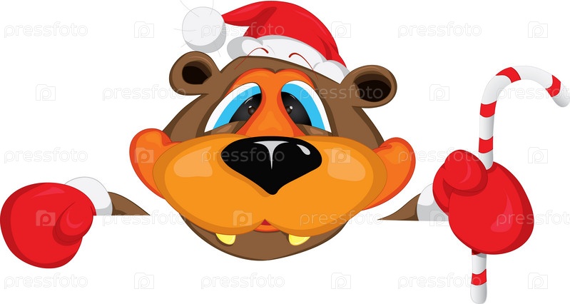 Веселый новогодний медведь держит плакат и конфету