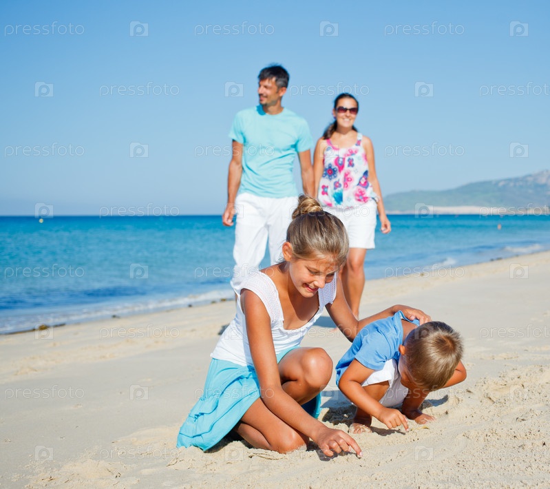 Семья отдыхает на пляже