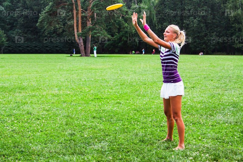 Молодая и красивая женщина играет с фрисби в парке
