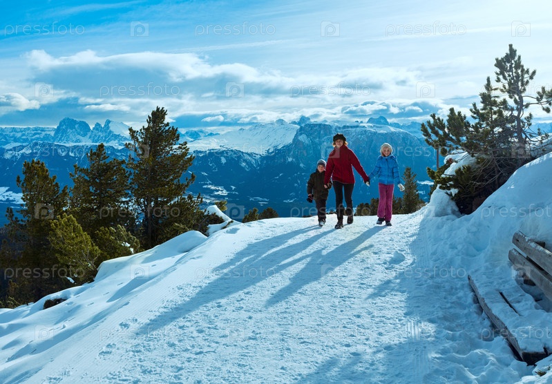 Семью гуляет на склоне горы зимой