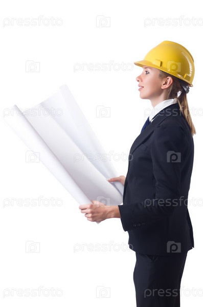 Женщина с чертежами, изолированная на белом фоне