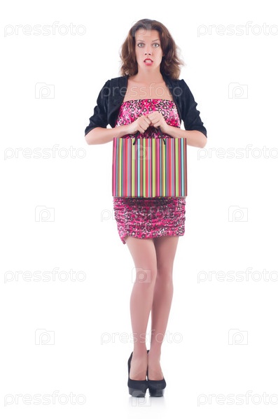Девушка после шопинга на белом фоне