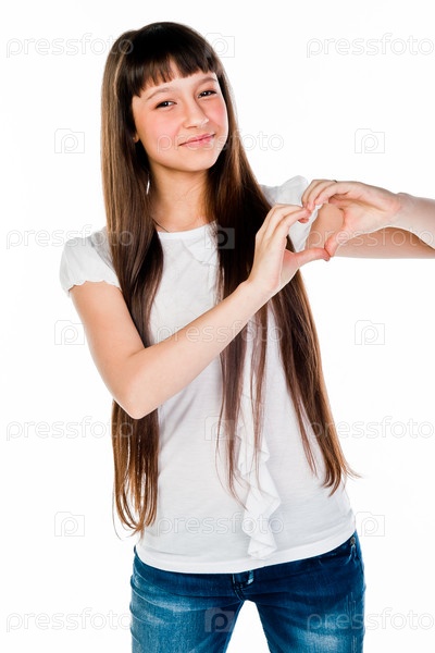 Маленькая и красивая девочка показывает пальцами сердце