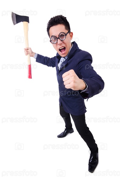 Смешной бизнесмен с топором на белом фоне