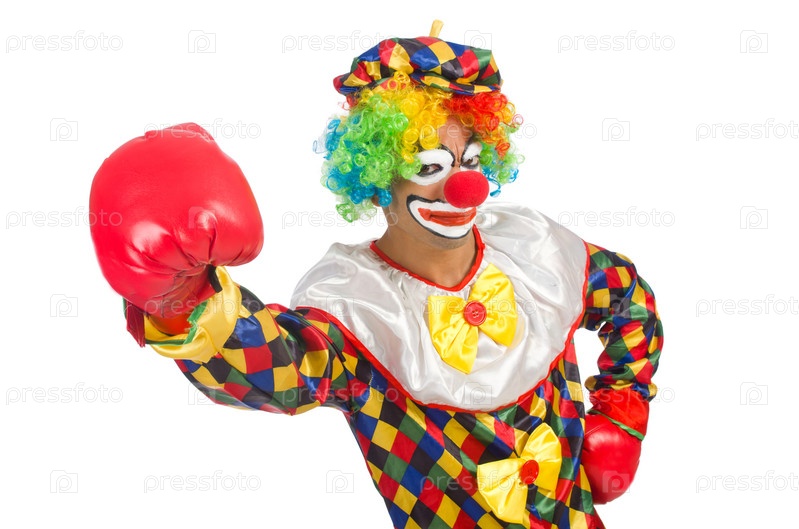 Клоун с боксерскими перчатками, изолированный на белом фоне