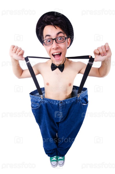 Забавный мужчина с большими брюками, изолированный на белом фоне