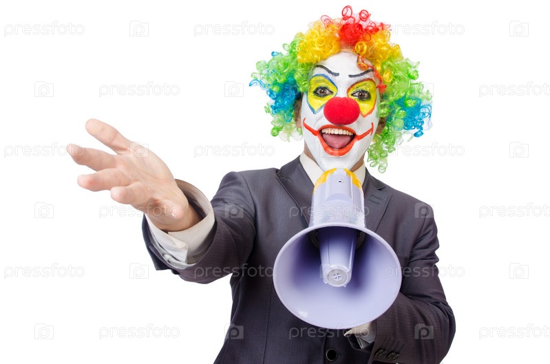 Бизнесмен клоун с громкоговорителем на белом фоне