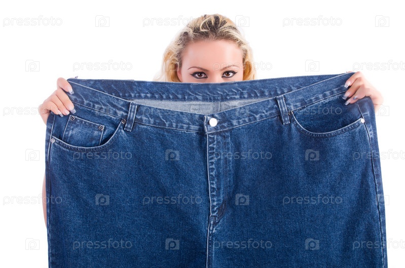 Женщина с большими джинсами в концепции диеты