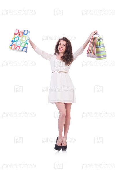Высокая девушка после хорошего шопинга на белом фоне