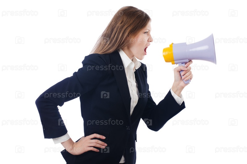 Женщина с громкоговорителем на белом