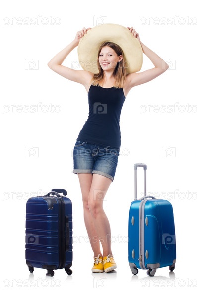 Молодая девушка путешествует, изолировано на белом фоне