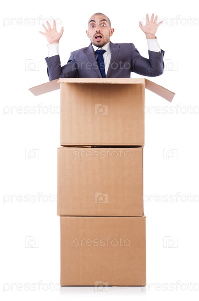 Бизнесмен с коробкой, изолированный на белом