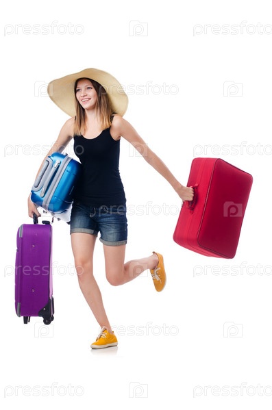 Молодая девушка путешествует, изолировано на белом фоне