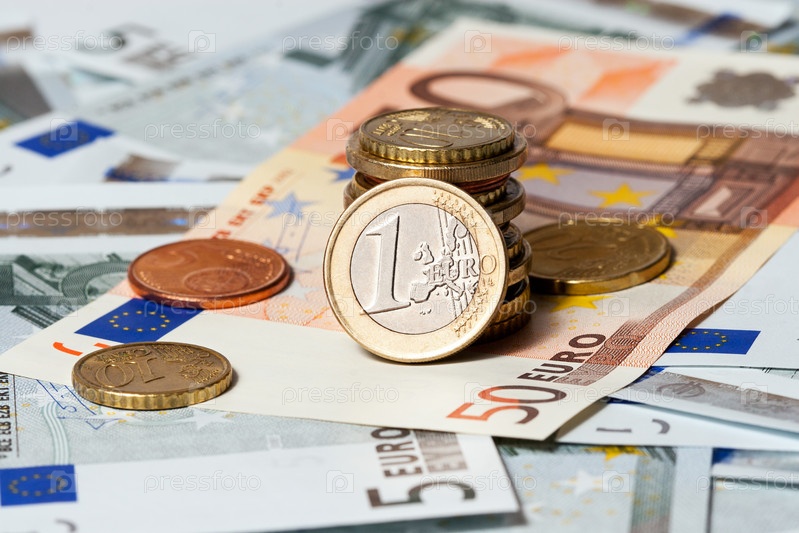 Банкноты и монеты достоинством пять и пятьдесят евро