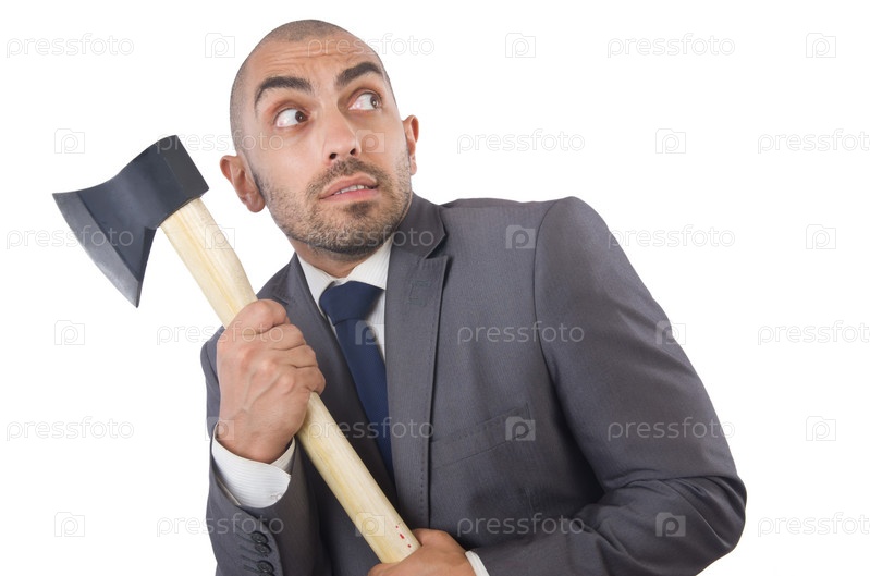 Смешной бизнесмен с топором на белом фоне