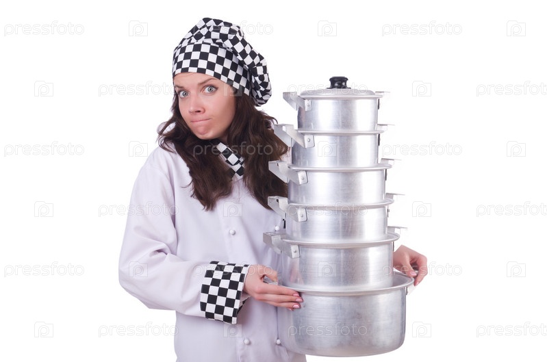 Повар с кастрюлями на белом фоне