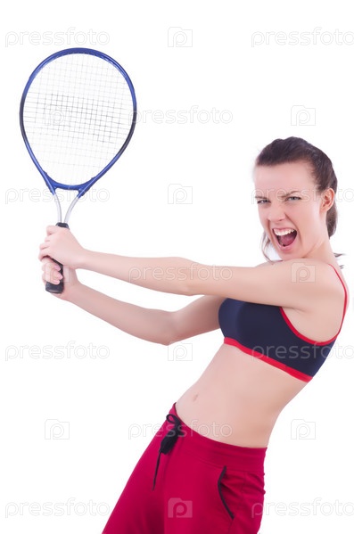 Женщина играет в теннис на белом фоне