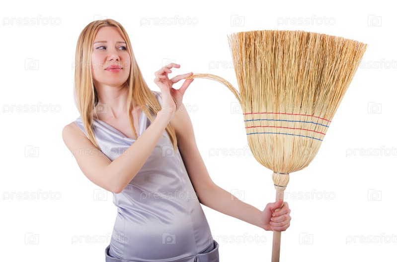 Молодая женщина с веником на белом фоне