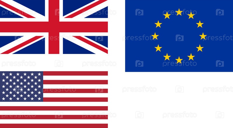 Флаги Великобритании, Европейского союза (Европа) и Соединенных Штатов Америки (США)