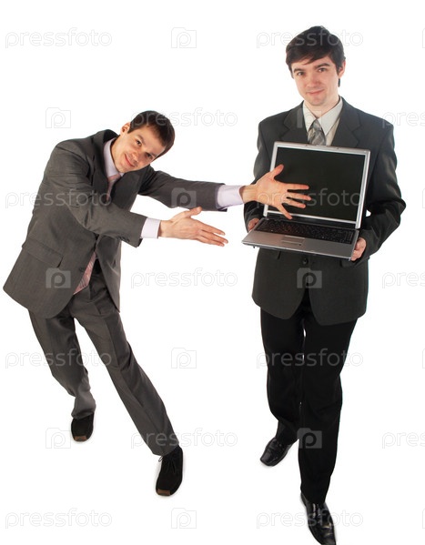 Два менеджера делают презентацию на белом фоне