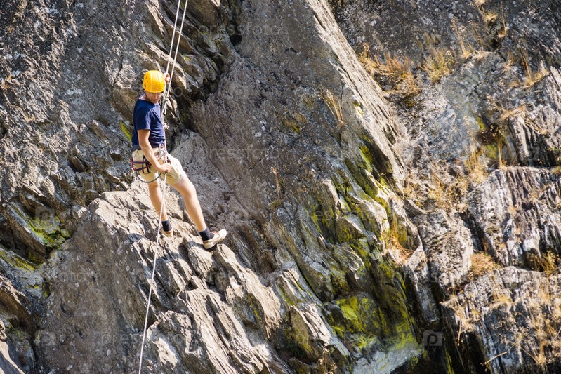 Молодой человек поднимается на скалу