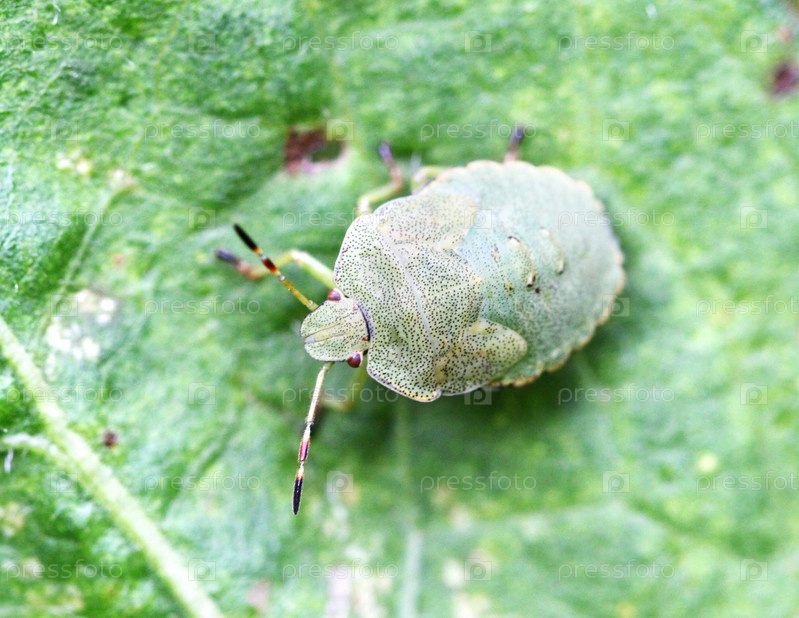 Зеленый клоп сидит на зеленом листе