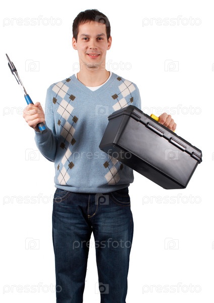Молодой брюнет с ящиком инструментов на белом фоне