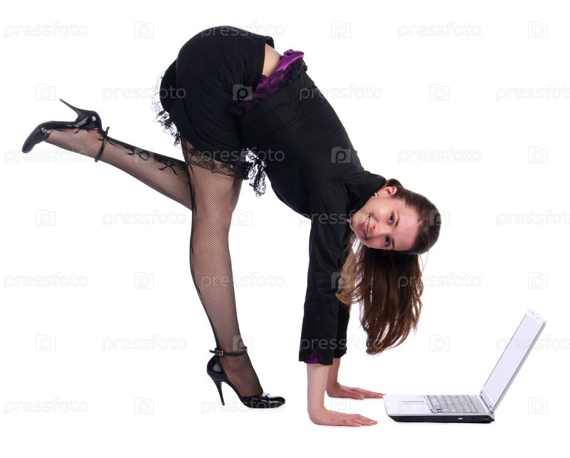 Девушка в черном наклонилась к ноутбуку. Изолирована на белом