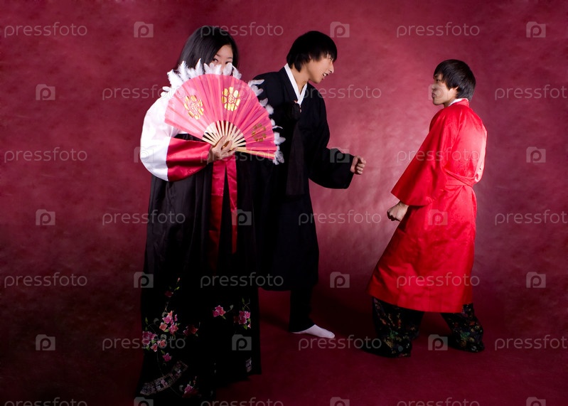 Азиаты в традиционной одежде на красном фоне