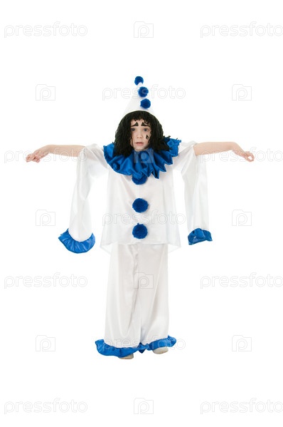 Ребенок в костюме Пьеро, изолирован на белом фоне