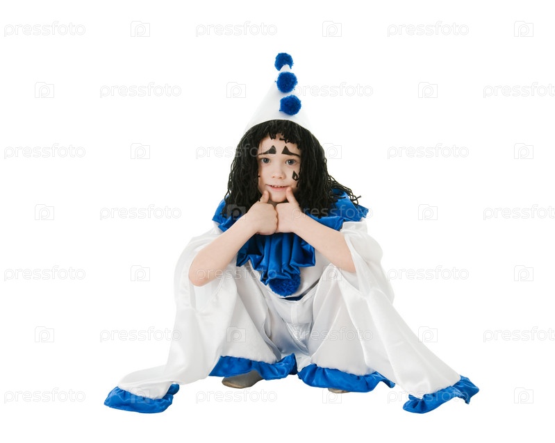 Ребенок в костюме Пьеро, изолирован на белом фоне