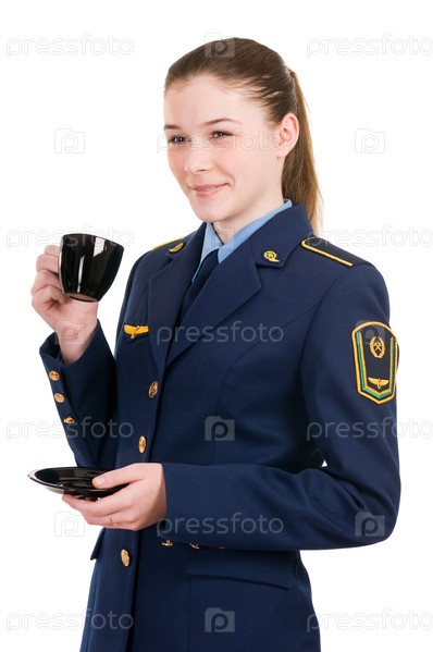 Девушка в железнодорожной форме с чашкой, изолирована на белом фоне