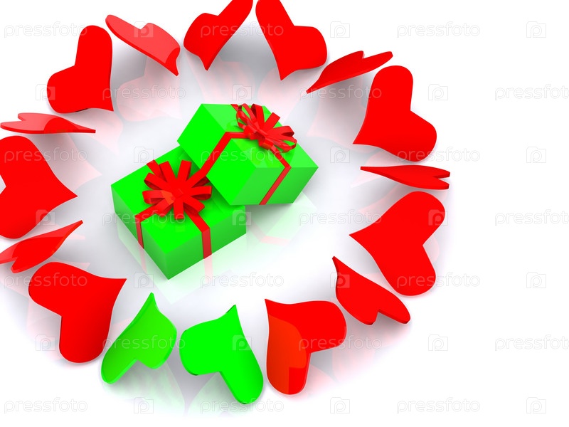 Сердца вокруг подарков. 3D