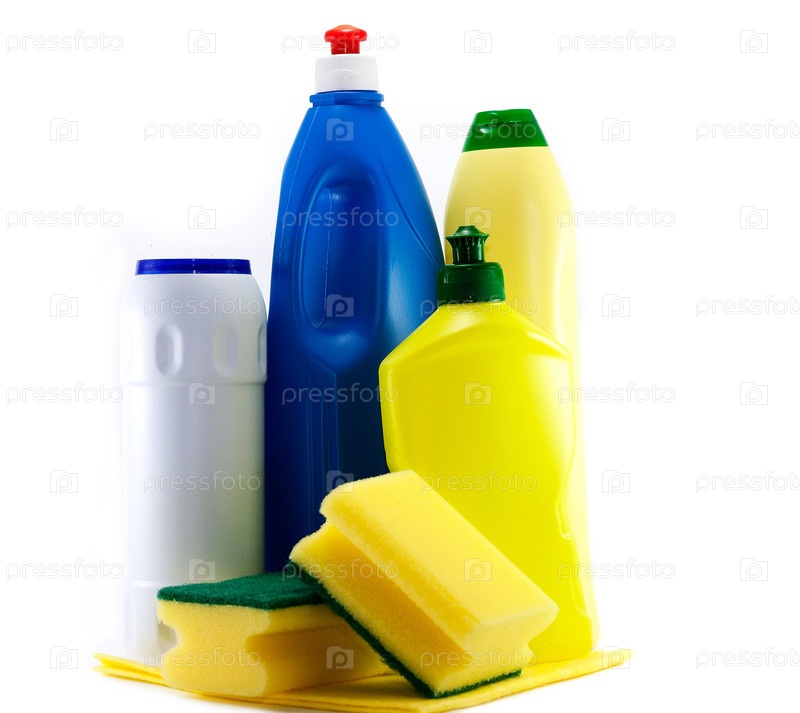 Чистящие средства и губки, изолированные на белом фоне