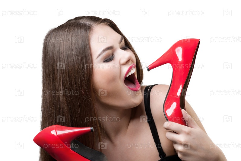 Портрет девушки с парой красных туфель в руках