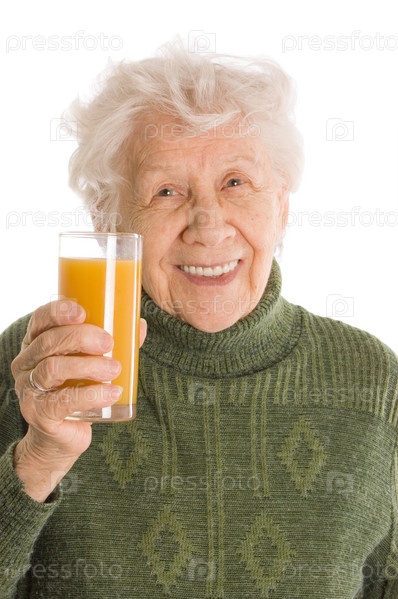 Пожилая женщина держит стакан сока в руках