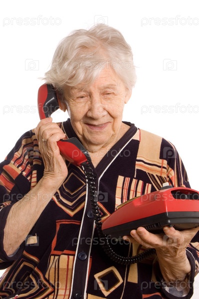 Портрет пожилой женщины с телефоном на белом фоне