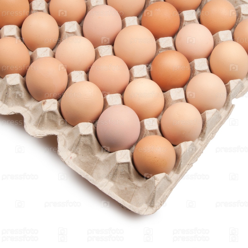 Куриные яйца в упаковке на белом фоне
