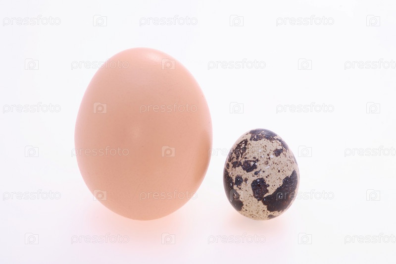 Куриное и перепелиное яйцо на белом фоне