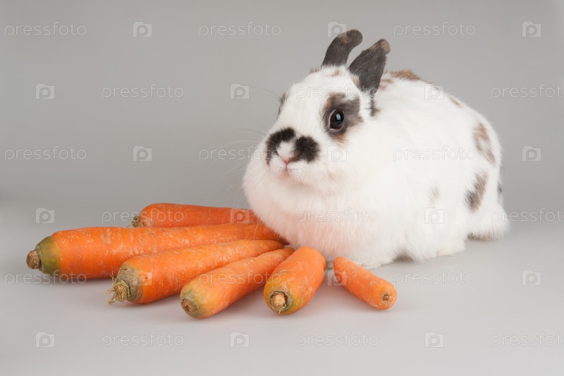 Пятнистый кролик с морковкой на сером фоне