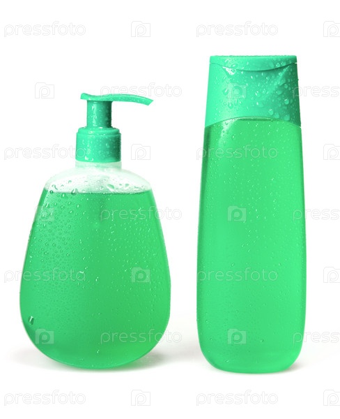 Шампунь и жидкое мыло на белом фоне