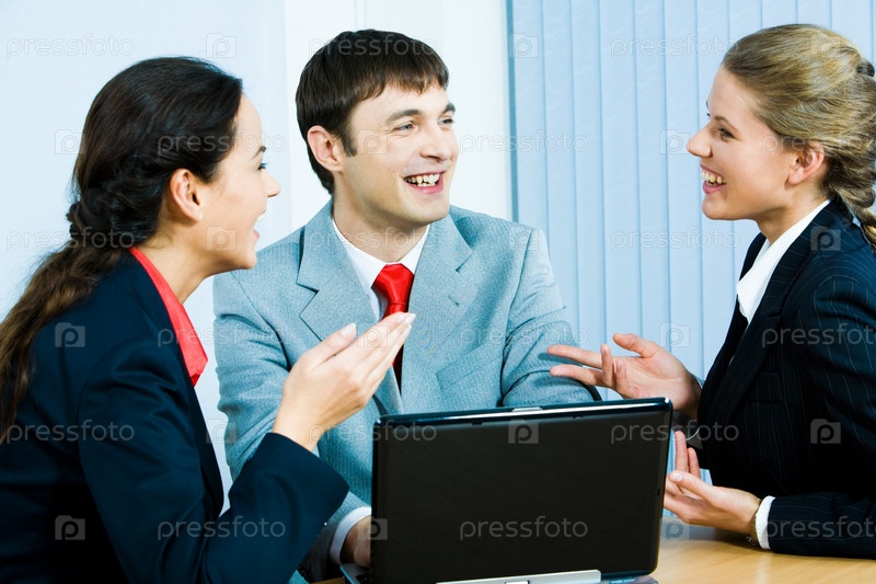 Портрет трех деловых партнеров, сидящих в офисе и смеющихся во время обсуждения бизнес-планов