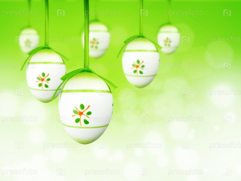 Пасхальные яйца на ленточках на зеленом фоне