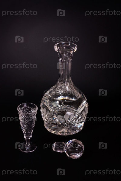 Стеклянный графин и рюмка на черном фоне