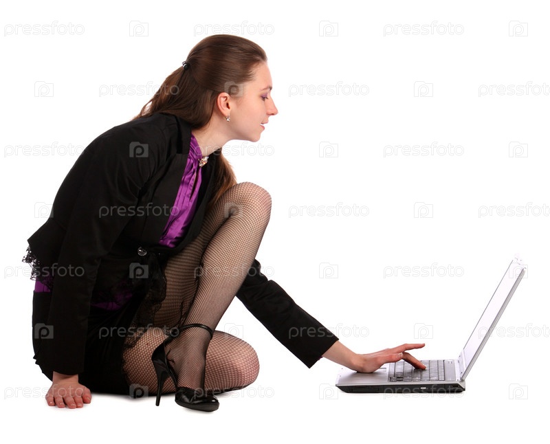 Девушка в черном костюме, сидящая на полу с ноутбуком