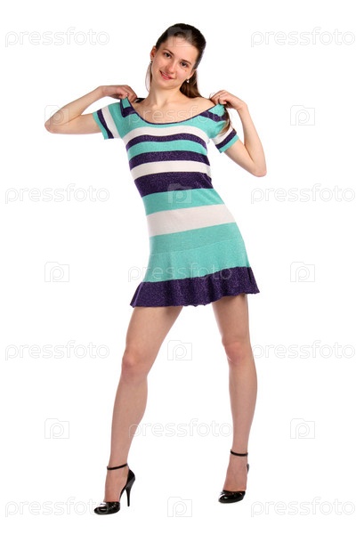 Девушка в полосатом платье позирует на белом фоне