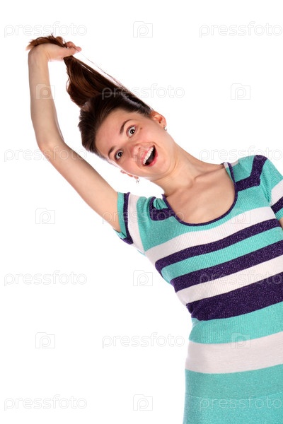 Девушка в полосатом платье позирует на белом фоне