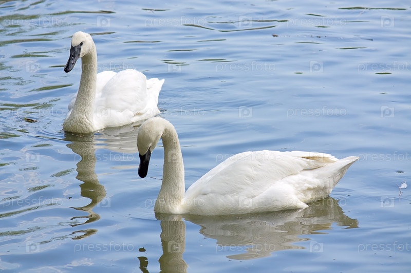 Два белых лебедя плавают на поверхности водоема